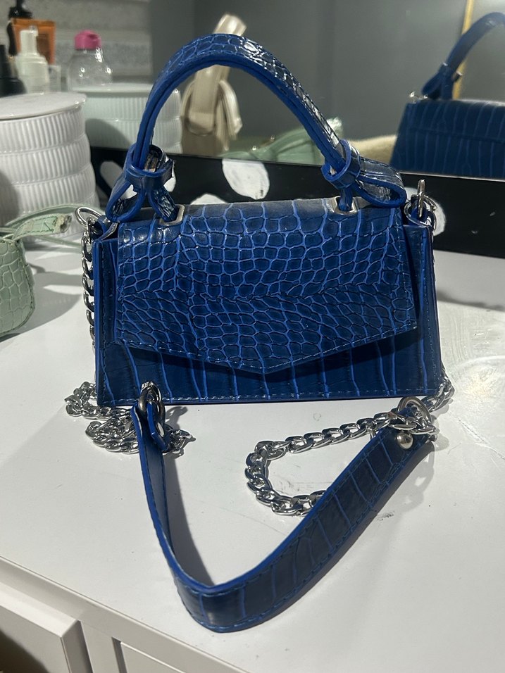 Parlak mavi deri ve yılan derisi desenli, zincir detaylı kadın çantası, trend sokak modasına uygun.