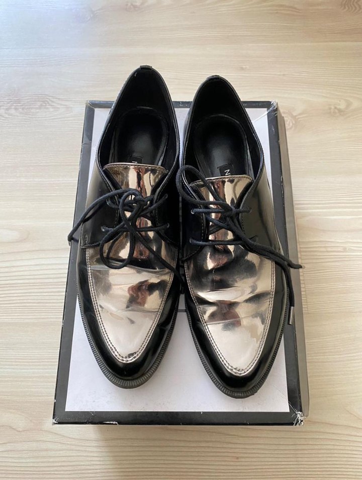 Parlak metal detaylı, bağcıklı siyah stiletto kadın ayakkabısı, ofis için şık ve modaya uygun. Oxford/loafer ayakkabı Orijinal nine west ayakkabı çok şık Fazla ayakkabım olduğu için satıyorum Sayılı giydim kutusuyla gönderilecektir #oxford #loafer #ninewest #zara