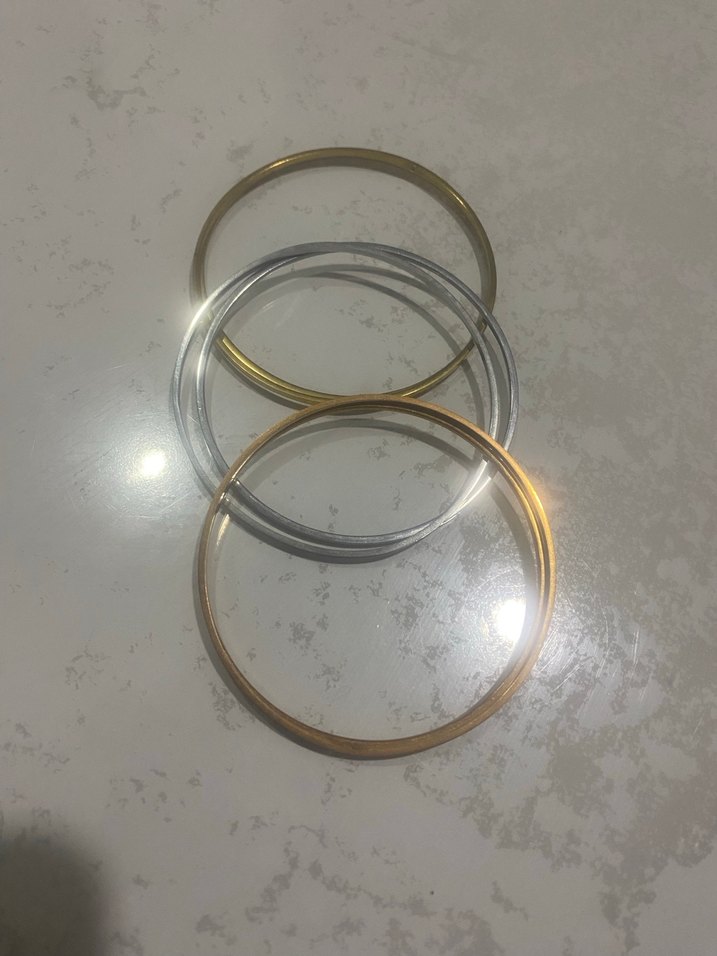 Parlak altın ve gümüş tonlarında, desen içermeyen minimalist metalik kadın bilezik seti. Düğünler için uygun.
