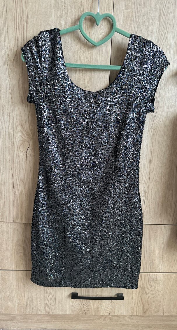 Parlak yıl desenli, v yaka ve kolsuz, vücuda oturan midi abiye elbise. ✨