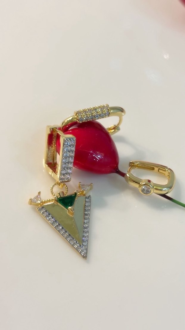 Renkli payetli desenlerle süslenmiş kısa altın küpeler, çağdaş ve gösterişli tasarıma sahip, düğünler için uygun. ✨