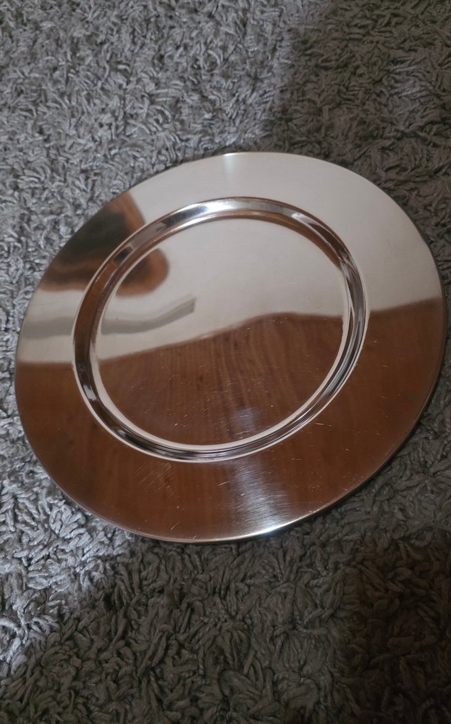 Parlak yüzeye sahip gümüş renkli, modern ve desensiz tepsi. Ben mum tepsisi olarak dekoratif için kullandım. 31 cm genişliğinde Yurtdışından alınmıştır. ️