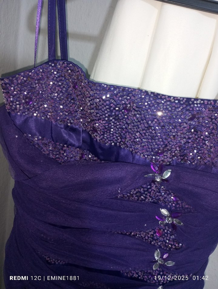 Parlak mor renkte abiye elbise özel günlerde giyilir düğünde bir kere giyildi dolapta yer tutuyor diye satılık