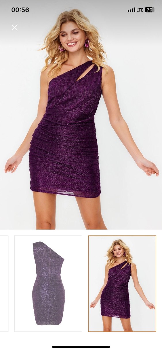 Parlak mor renkli, pilili detaylara sahip, vücuda oturan mini elbise. Asimetrik ve ince askılı yakasıyla çağdaş ve iddialı bir görünüm sunar.