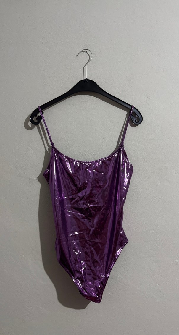 Parlak kumaştan, askılı ve drapeli tasarıma sahip mor renk, midi boy, bağlama desenli, dar kesim mayo. Parti ve sokak stili için uygun.