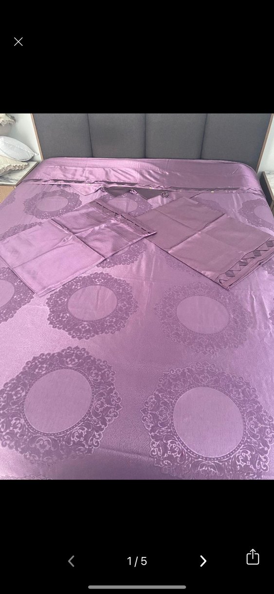 Çeyizim için alınmıştı hiç kullanılmadı özel dikim. Parlak yüzeyli, baskılı dairesel desenlere sahip mor yatak pikesi ve uyumlu yastık kılıfları.