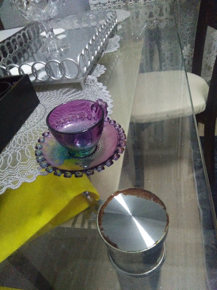 Parlak ve canlı yüzeye sahip mor cam fincan ve kenarı süslü tabak. ☕