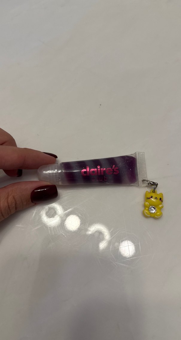 Claire's markalı, parlak mor renkte dudak parlatıcısı. Küçük sarı kedi figürlü aksesuarı vardır. Dudaklara parlaklık katar. Hiç kullanılmadı kapalı ambalaj