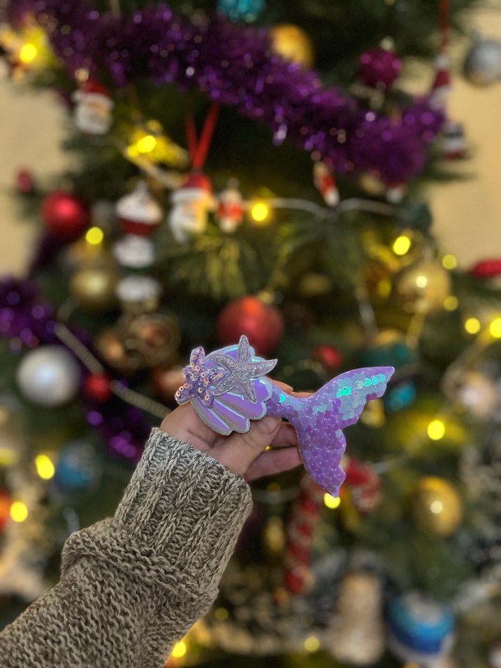 Mor tie-dye desenli, sim detaylı deniz kızı şeklinde plastik saç tokası. Pop kültür, bohem ve retro tarzda. ♀️