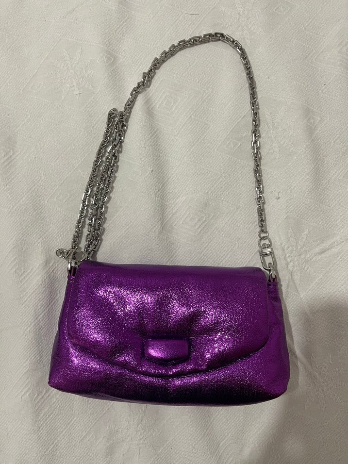 Parlak mor deri, yılan desenli ve zincir askılı kadın çantası, gösterişli sokak modası için uygun. Sıfır ürün.