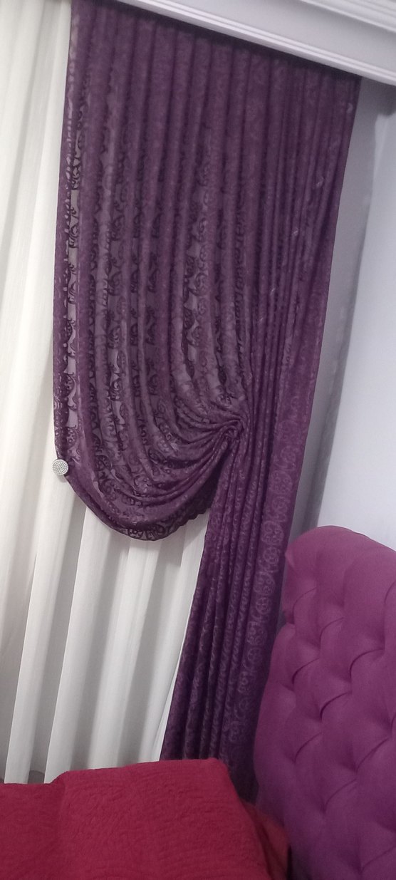 Parlak mor renkte, desenli ve modern klasik tarzda perde. Odaya şıklık ve doku katar.