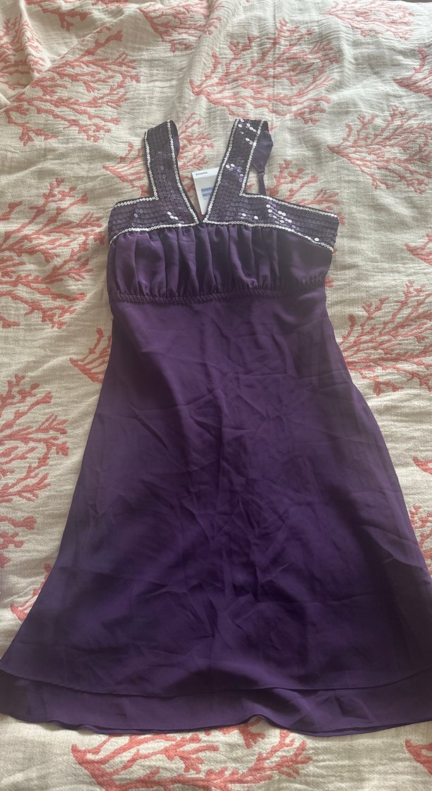 Parlak mor renkte, pul payetli ve vücuda oturan midi gecelik. Etiketi üzerinde.