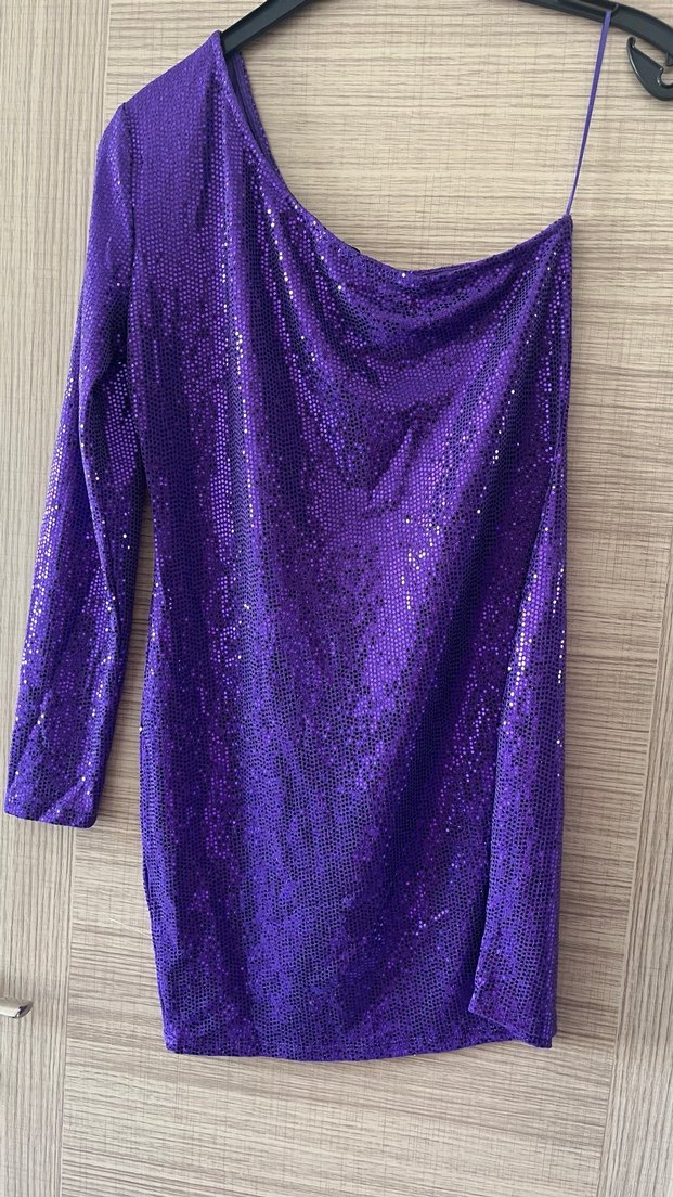 Parlak mor yılan desenli, drapeli yakalı, tek uzun kollu, vücuda oturan kadın abiye elbisedir.
