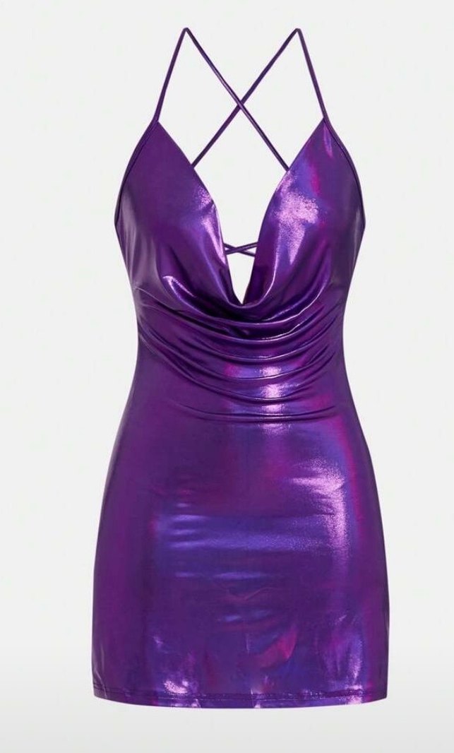 Parlak mor renkli, saten dokulu, drapeli V yaka ve ince askılı, vücuda oturan mini elbise, gösterişli parti tarzı için uygundur.