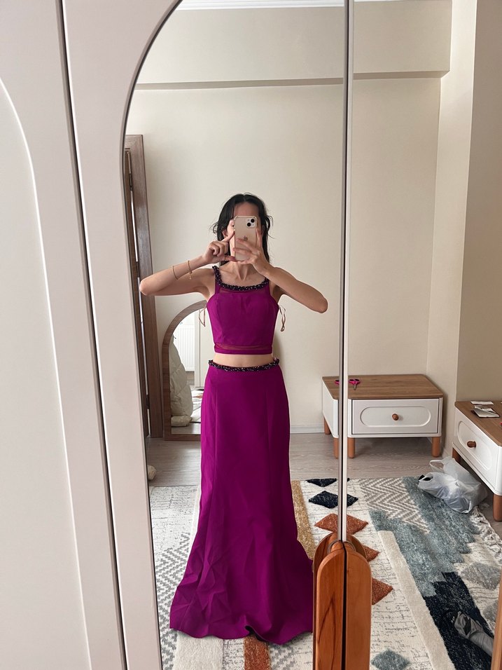 Parlak mor renkte, straplez ve drapeli, ince askılı, vücuda oturan kadın abiyesi. Minimalist ve normcore tarzda, düğün için uygun.