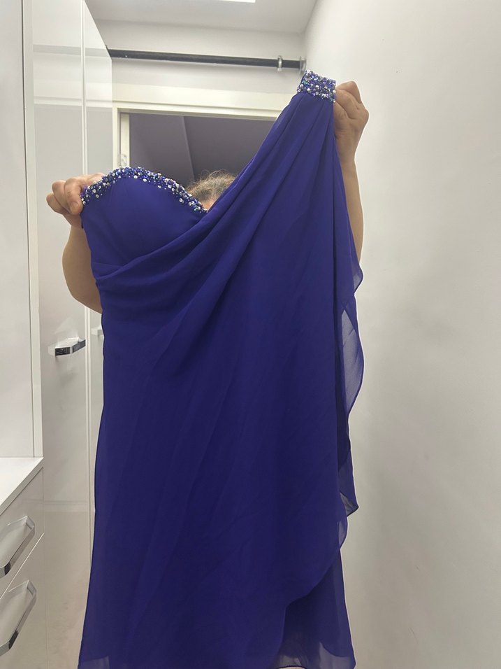 Parlak işlemeli detaylara sahip straplez, drapeli ve vücuda oturan mor gece elbisesi, düğün gibi özel anlar için uygundur.