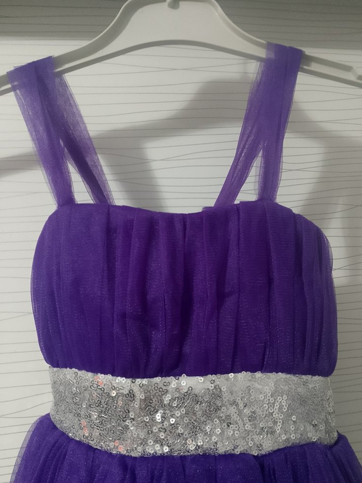 Parlak mor renkte, drapeli üst kısmı ve askılı kolları olan abiye elbise. Gümüş pul işlemeli kemer ile tamamlanmış, midi boy, şık ve fit kesim.
