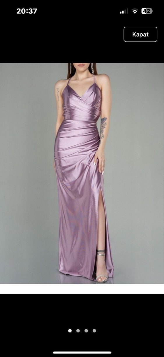 Parlak mor renkte, drapeli ve V yakalı uzun abiye elbise. İnce askılı, yan yırtmaçlı, düğünler için uygun, çağdaş ve şık tasarım.✨
