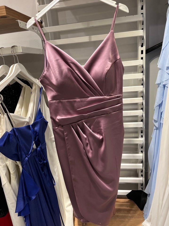 V yaka ve ince askılı, parlak mor renkte, drapeli ve uzun kesim, dar kesim abiye elbise. ✨