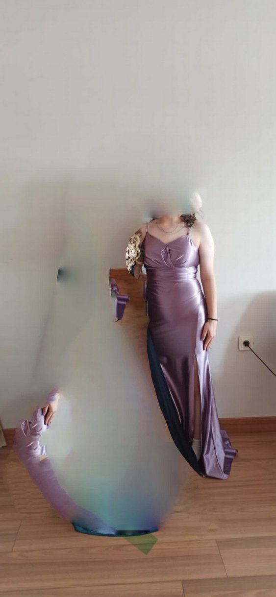 Parlak kumaştan, drapeli ve askılı uzun mor abiye elbise. Straplez yaka yırtmaçlı ve vücuda oturan kesimiyle düğünler için şık ve göz alıcı. Bir defa giyildi kurutemizlemeye verildi tertemiz hiçbirşeyi yok s m beden