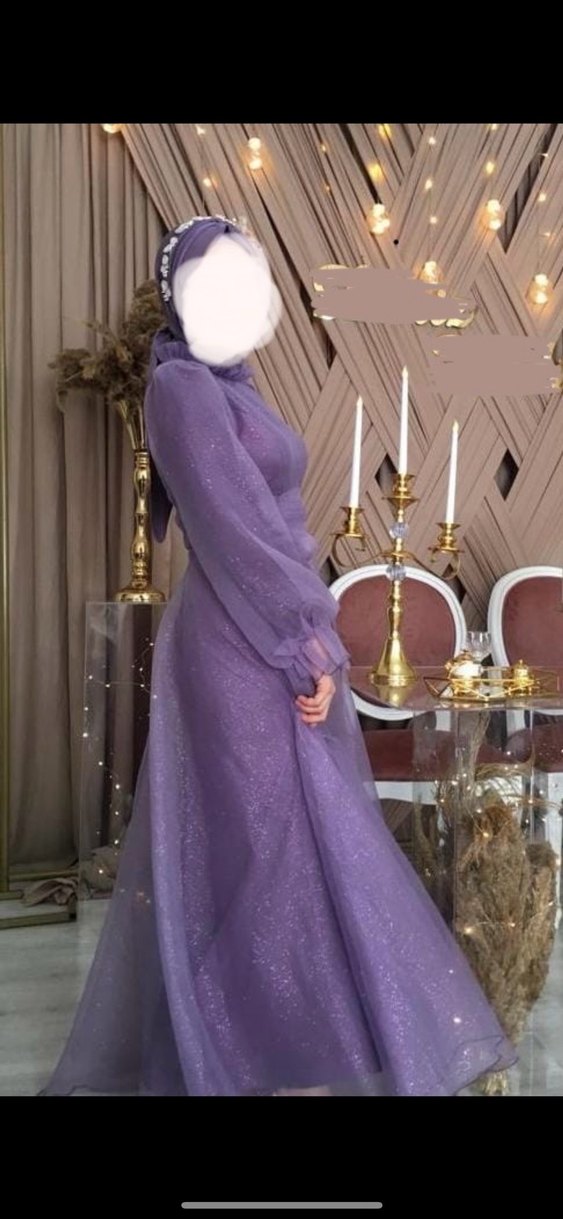 Parıltılı mor, yüksek yakalı ve uzun kollu, drapeli, fit kesim uzun abiye elbise. Nişan için uygun, gösterişli goth tarzda. Bir kez nişanımda giydim çok hafif ve rahat