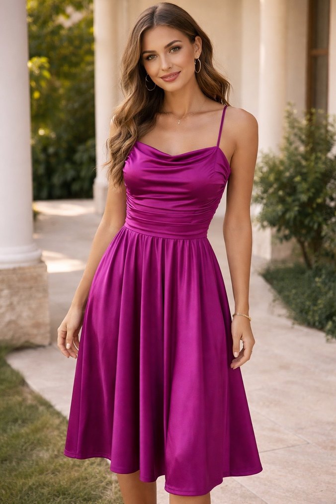Parlak kumaştan, ince askılı ve drapeli yakaya sahip, bohem tarzda, fitted kesim uzun mor abiye elbise. Cesur parti kombinleri için uygun.