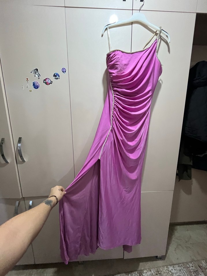 Parlak mor renkte, drapeli ve askılı uzun abiye elbise, vücuda oturan kesimiyle göz alıcı bir şıklık sunar. ✨