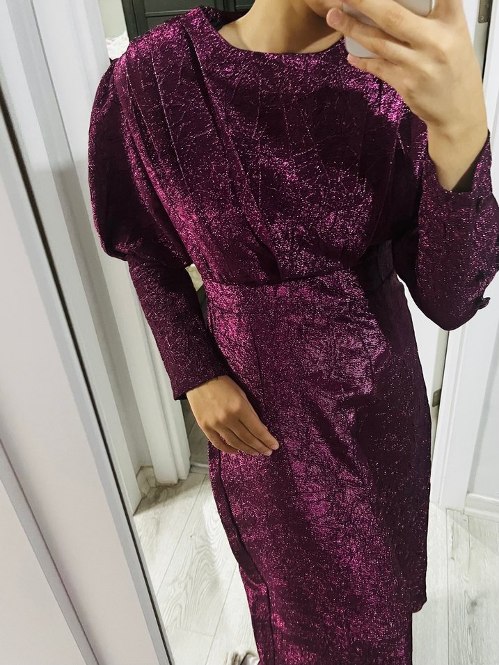Parlak sentetik kumaştan yapılmış, drapeli ve uzun kollu, bisiklet yaka, dar kesim uzun elbise. Parti için çağdaş ve göz alıcı bir stil sunar. ✨