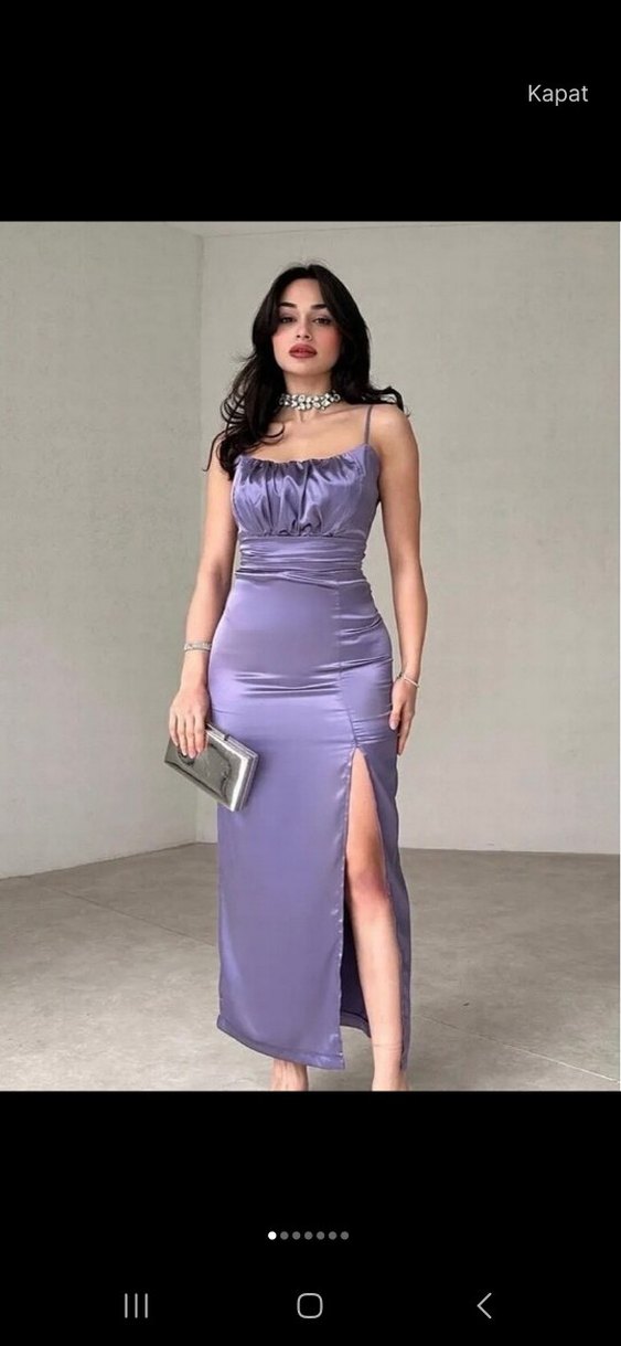 Parlak kumaştan, drapeli tekne yakalı ve askılı kollu, romantik akşamlar için uygun, vücuda oturan uzun mor elbise.