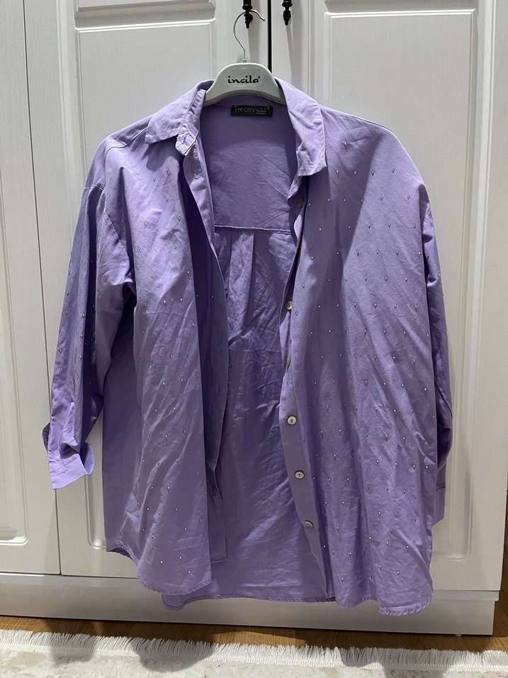 Linen kumaştan, parlak mor renkte, düğmeli, yakalı ve uzun kollu, bol kesim midi gömlek. Günlük rahat kullanıma uygundur. Birkaç defa giyildi herhangi bir kusuru yok