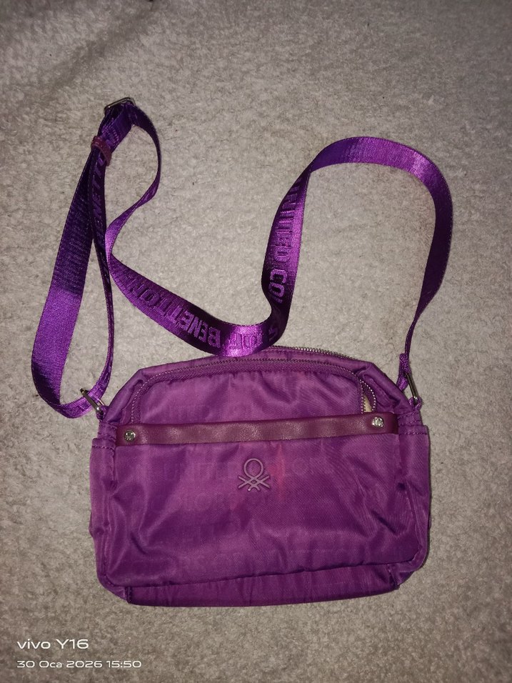 Parlak mor renkte, kemerli tasarıma sahip sentetik kumaştan kadın çapraz çanta. Trendy casual ve athleisure stil için uygundur. ön kısmında hafif bı renk değişikliği var sebebini anlayamadım