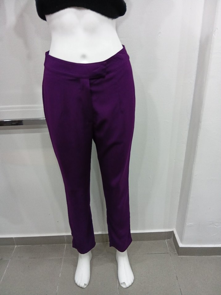 Parlak mor, ipeksi kumaştan yapılmış, midi boy ve regular fit kadın pantolon. Ofis için şık ve minimalist bir tercih. ✨