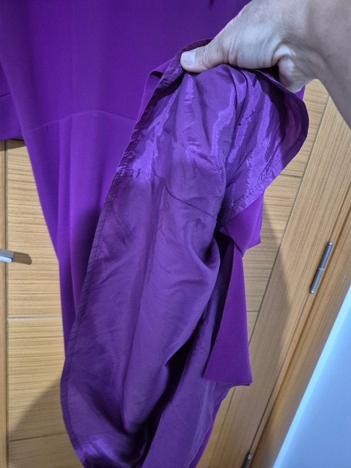 Parlak mor renkte, uzun kollu ve bol kesimli kadın elbise Uzun boyu ve çağdaş avant-garde tarzı ile dikkat çeker. ✨rengi son resimdeki gibi fotoda mor çıktı