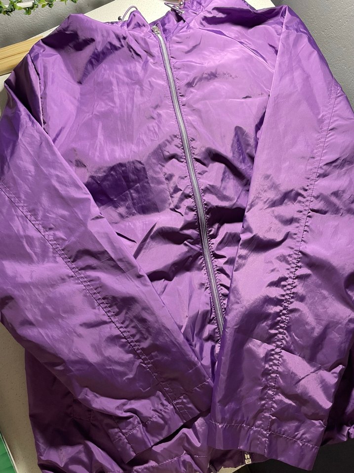 Parlak mor renkte, fermuarlı önü ve kesimli yakası olan, sentetik kumaştan yapılmış kadınlar ve gençleriçin fit kesim yağmurluk. ️