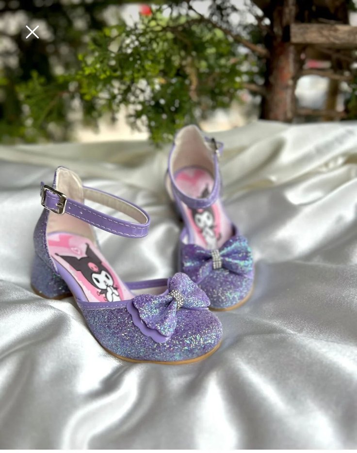 Parlak simli mor babet ayakkabı, pastel tie-dye desenli ve fiyonk detaylıdır. Kauçuk malzemeden yapılmış, bilek askılıdır. Ürün sıfırdır