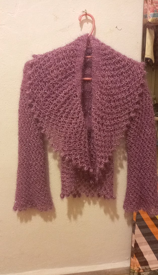 Parlak mor renkte, uzun kollu ve kayık yaka kız çocuk bolero. Örgü kumaştan yapılmış, bohem tarzda ve dar kesim.