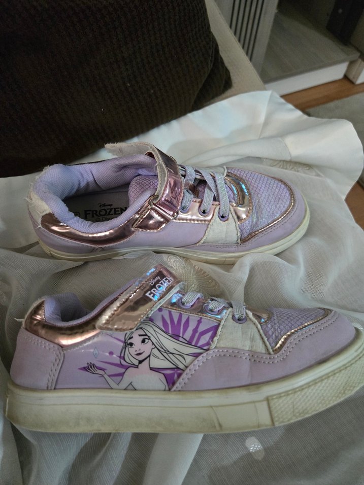 Parlak mor renkte, baskılı Frozen desenli, kolay giyilen cırt cırtlı kız çocuk spor ayakkabısı.