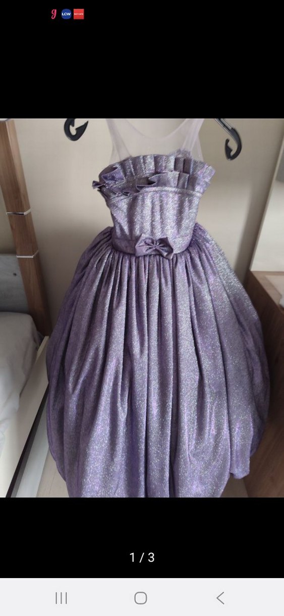 Parlak sentetik kumaştan, straplez, pileli detaylı ve fiyonk süslemeli, fitted kesim mor kız çocuk elbisesi. Kolsuz ve gotik tarzda, şık bir görünüm sağlar. ✨
