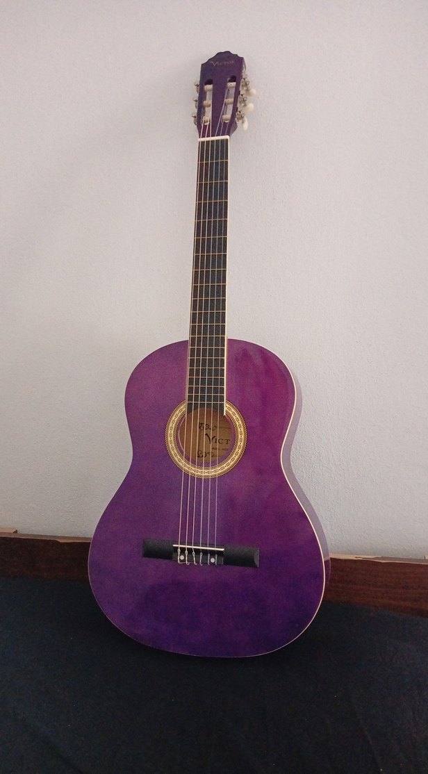 Altı telli, parlak mor renkte klasik gitar, ahşap gövdesiyle müzikseverler için uygundur.