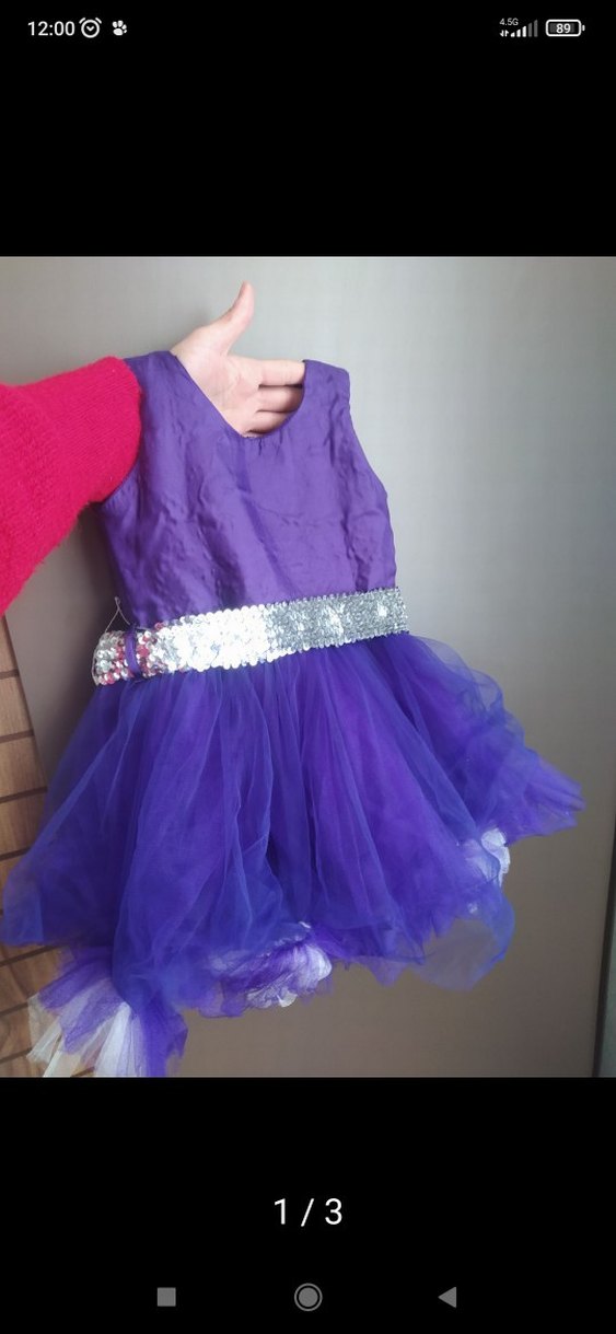 Kolsuz, parlak mor sentetik kumaştan, simli kemerli ve fırfırlı etekli kız çocuk elbisesi, trend bir görünüm sunar. ✨
