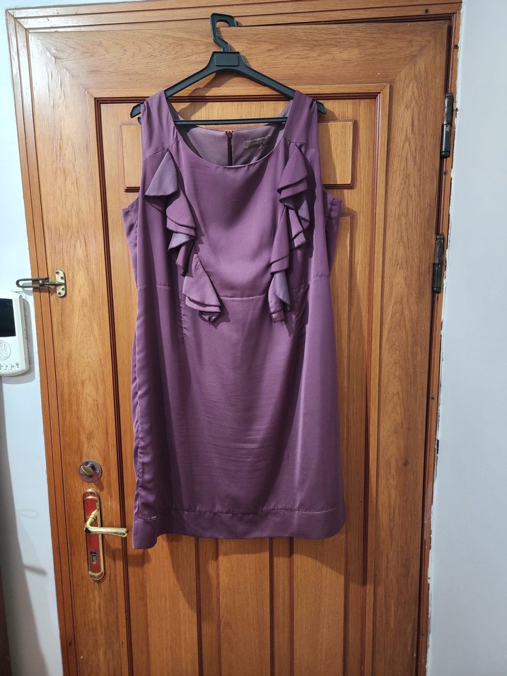 Parlak kumaştan, askısız ve vücuda oturan mor midi elbise, fırfır detaylarıyla romantik akşamlar için uygun.