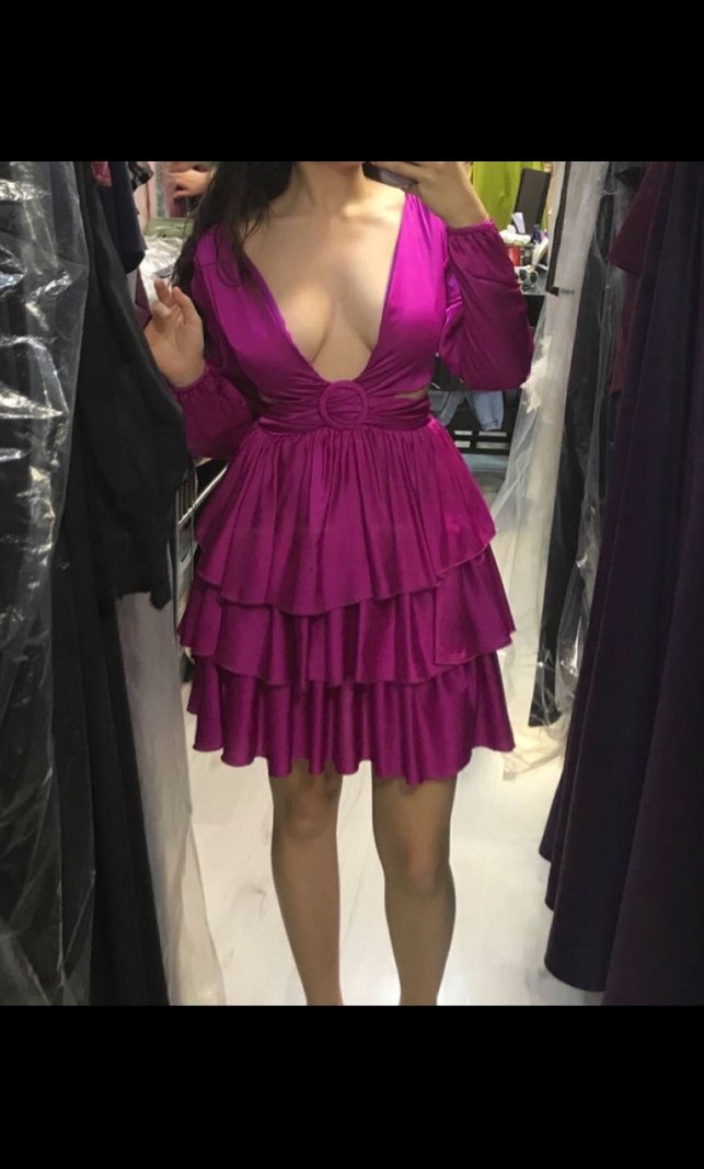 Parlak mor baskılı, kat kat fırfırlı, derin V yaka ve ince askılı, vücuda oturan mini elbise, şık ve göz alıcı bir parti kıyafeti.