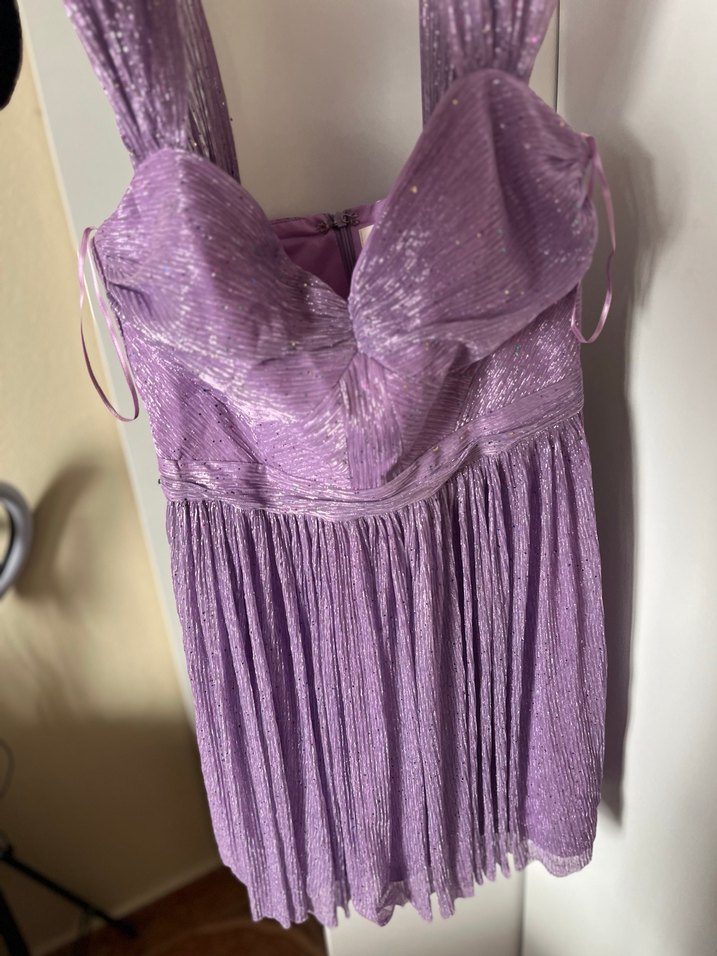 Fıtıllı, askılı kollu ve straplez yakalı, parlak mor kumaştan uzun abiye elbise, şık partiler için uygundur. Hiç kullanılmadı