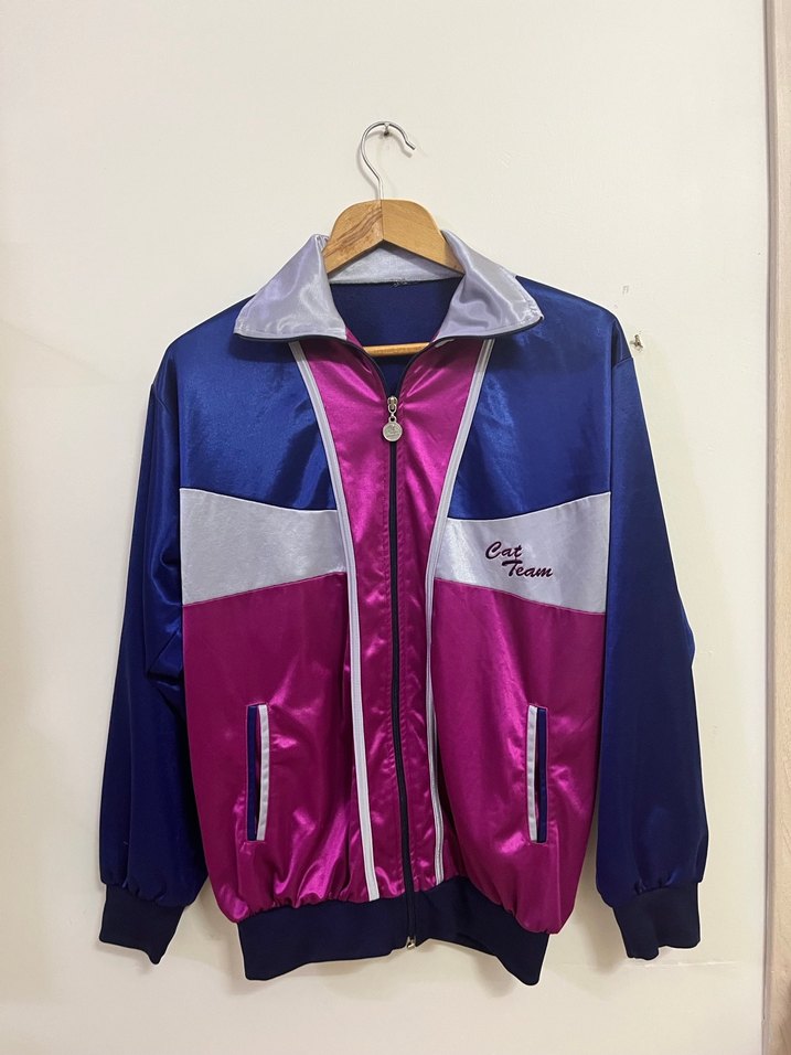 Parlak mor ve mavi ipeksi kumaştan, rahat kesim kız ceketi. Notch yaka, fermuarlı ön ve 'Core Team' nakışlı, cepli sokak stili.