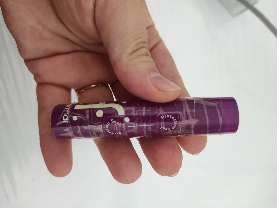 Parlak mor renkte, koruyucu ambalajlı sıfır lipbalm.