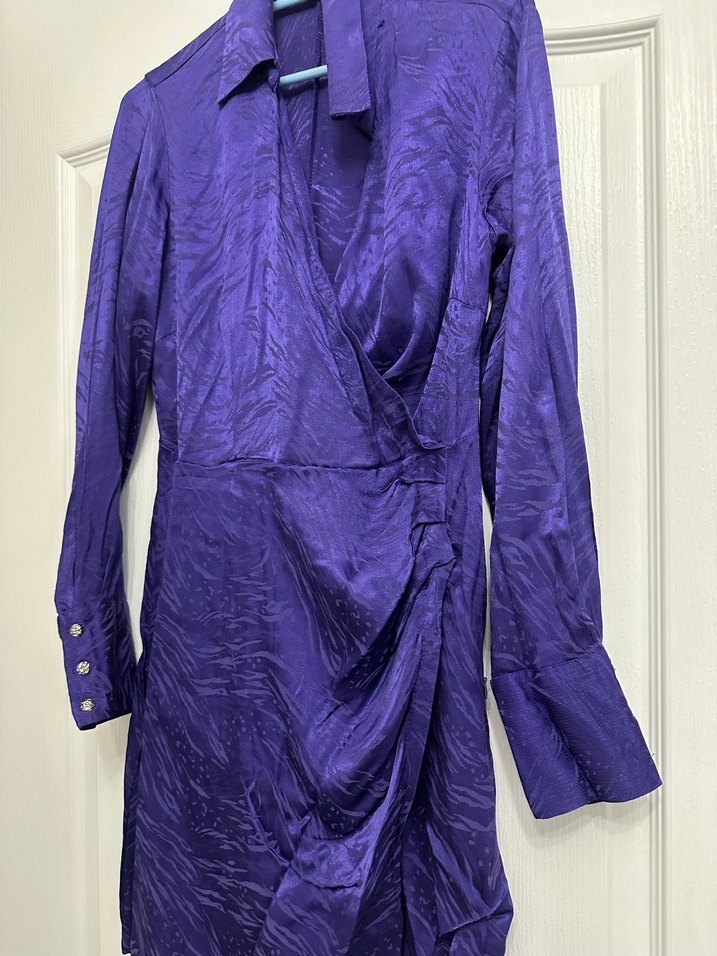 Parlak mor renkte, uzun kollu saten kesim kadın Bohem tarzı ve vintage dokunuşlu, uzun boydadır. Bir kere giyildi.