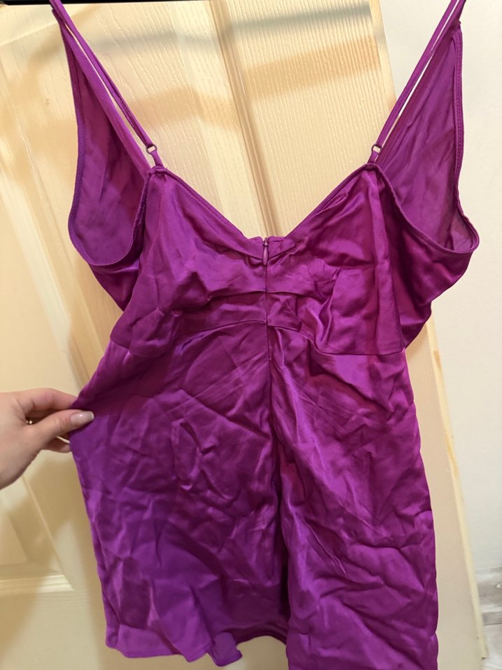Parlak mor saten kumaştan, kolsuz ve midi boy, bohem tarzda, vücuda oturan kadın bluz. Desensiz ve Paris alt kültürünü yansıtır.