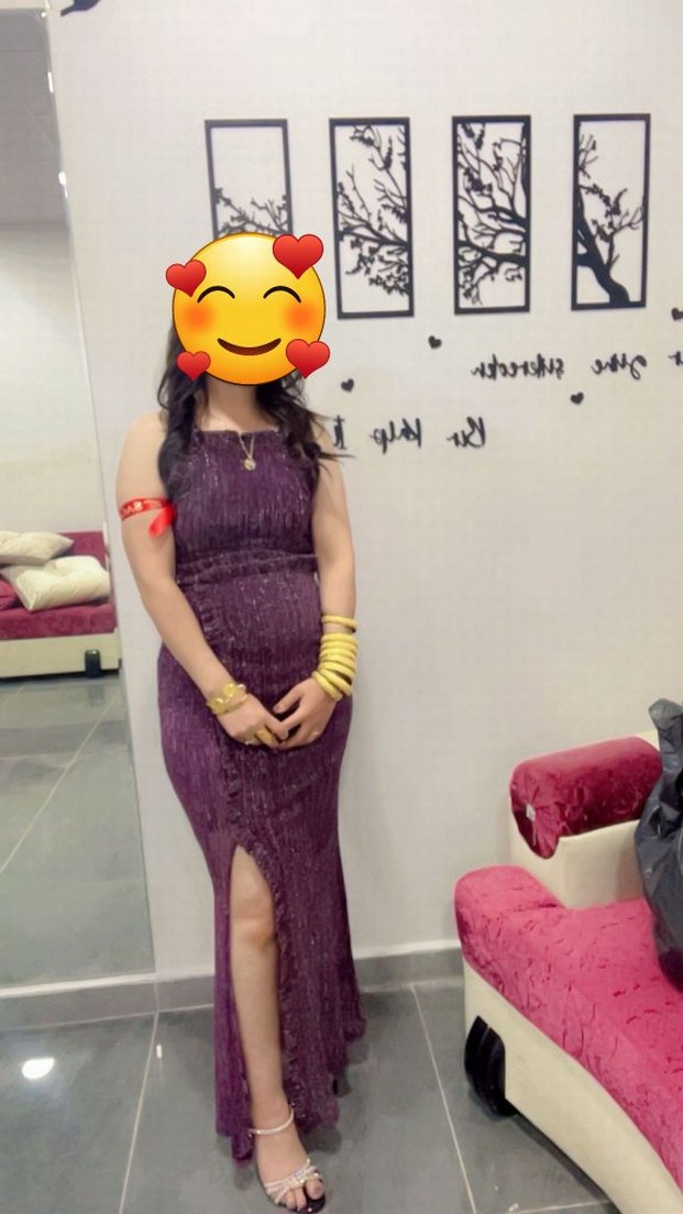 Parlak sentetik kumaştan, bağlama desenli, straplez yaka ve yırtmaçlı, uzun ve vücuda oturan mor hamile abiye elbisedir. Işıltılı ve gösterişli bir parti kıyafeti.