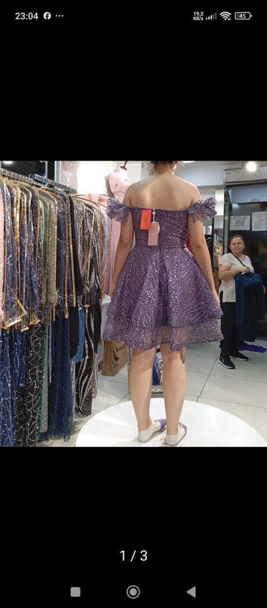 Straplez yaka, dantelli ve askılı kısa mor elbise. Parlak tie-dye desenli kumaşıyla partiler için göz alıcı bir seçenek. ✨