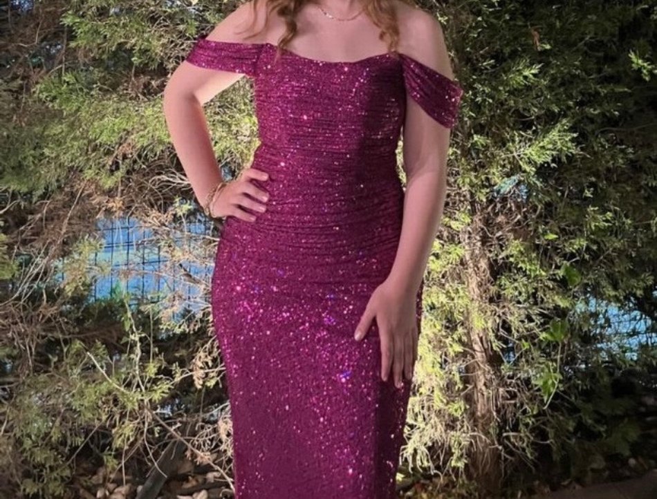Bu fitted uzun abiye elbise, straplez yaka ve omuzları açık askılı kollara sahiptir. Parlak mor simli desenlidir, cesur parti görünümü için ideal. ✨ben fermuarlı arkası ama yınede buyuk bedenler ıcın arkasını bağlamalı ıplıklı yaptırdım ıkı çesıt kullanabilirsiniz